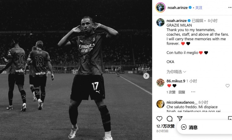 他写道:“感谢米兰!向我的队友、教练组以及所有工作人员致意,特别感谢球迷们的支持。这段时光我将永远铭记。❤️🖤”